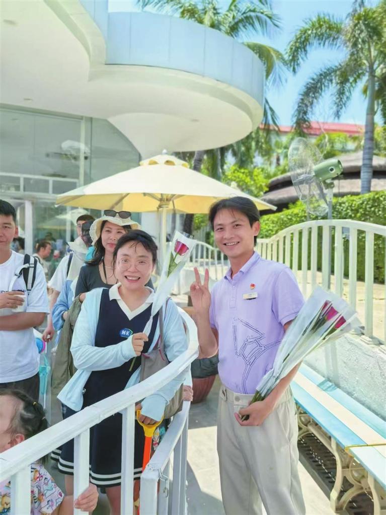 “哇哎噜!接待民众搭乘环岛不雅光车,一起奔赴北纬18°的梦境海岛——蜈支洲岛!”这句存眷飘溢的开场白,吴子茂每天齐要访佛大齐遍。作为景区主干司导,他在曲折的环岛公路上,把“安全员、清洁员、促销员、处事员、‘演员’”的“五员”文化,演绎成一谈流动的暖心风物。